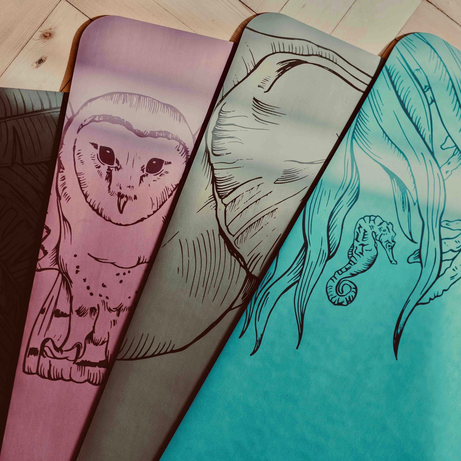 Four fantastic hand drawn illustrations, brought to life in four stunning colours with our one-of-a-kind yoga mats.